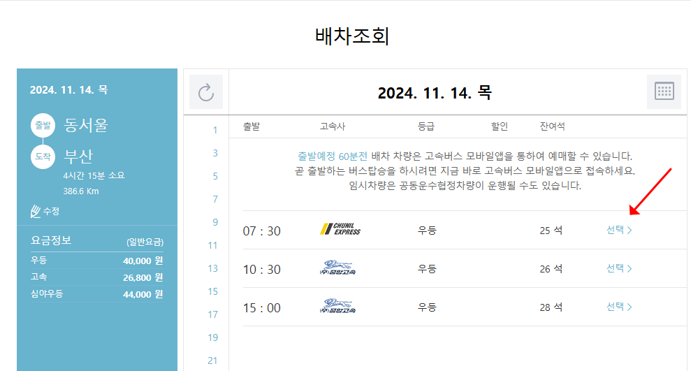 3) 배차조회가 나오는데 해당되는 시간과 잔여석 확인후 선택합니다.