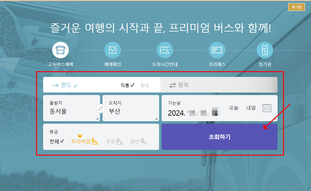2) 출발지와 도착지와 가는 날과 등급 선택 후 조회하기를 클릭합니다.