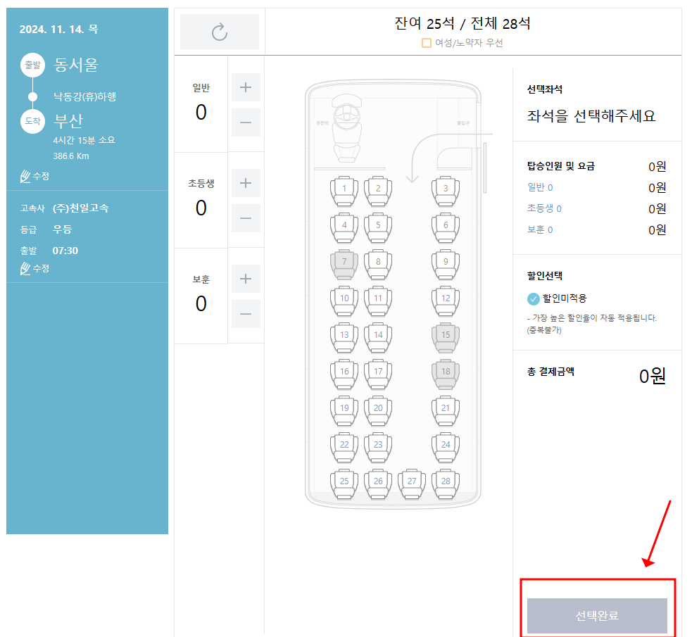 4. 인원수와 좌석 선택 후 선택완료를 누른 후 결제하면 끝!