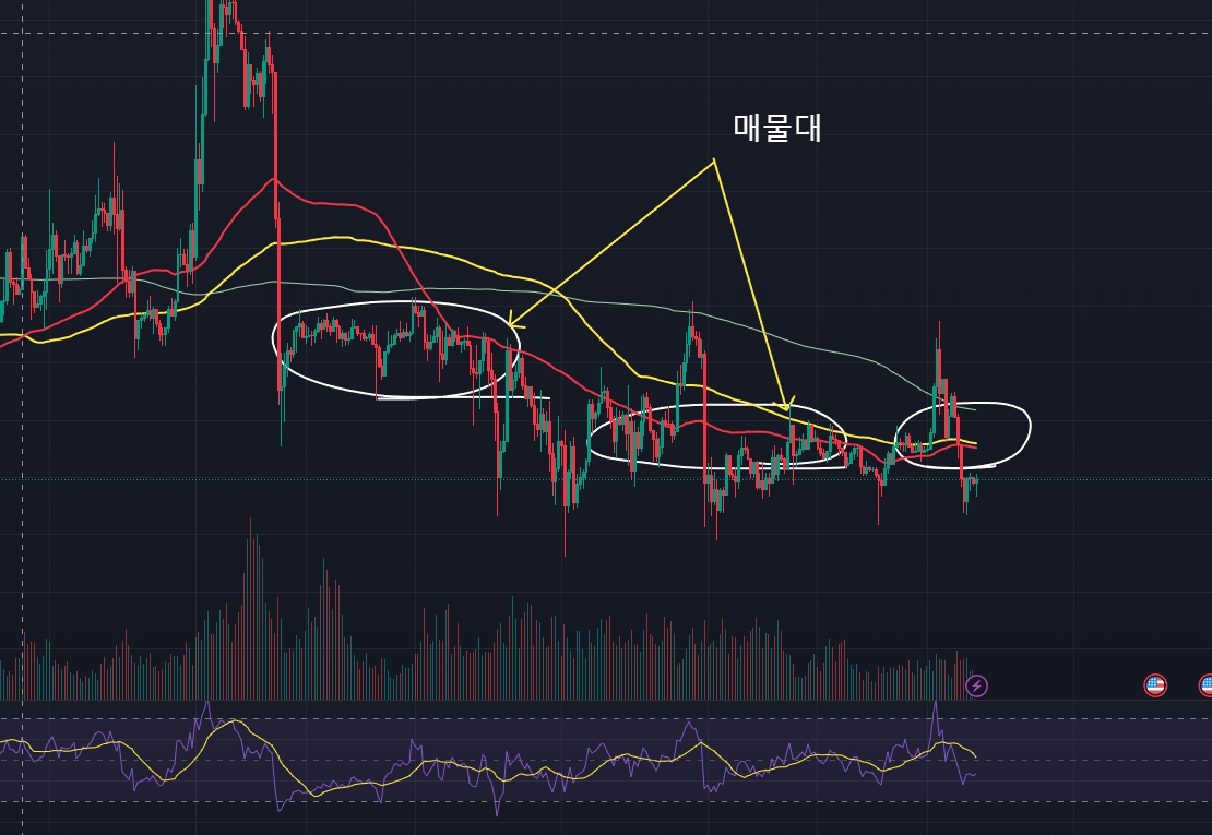 역배열로 놓여진 이평선은 단기선이 아래로 장기선이 위로 배열되어 있으며 60일선(빨간색)이 100일선(노란색)을 뚫지 못하고 아래로 다시 빠지고 있습니다. 이 말은 저항선 위쪽으로 상당한 매물대가 형성되어 있기에 이를 뚫기 위해서는 거래량이 한 번은 터져줘야 한다고 봐야 합니다.