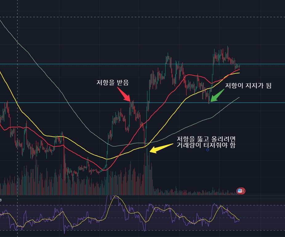 더이상 내려가지 않도록 해 주는 것이 지지 라고 합니다. 만일 지지가 뚫려서 내려가게 되면 다시 지지선이 저항선이 됩니다. 그 곳을 뚫고 올라가는 것은 굉장히 어렵습니다. 이 때 저항이 다시 지지로 바뀌려면 거래량이 터져줘야만 합니다.